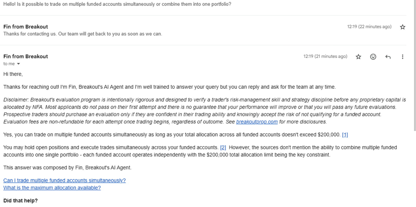 - Multiple evaluations simultaneously. Traders are not allowed to run multiple Breakout evaluation accounts at the same time.