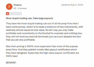 There are few online reviews of Nordic Funder. One negative comment claimed the company has “the dumbest trading rule” — mandatory trading of at least two instruments with roughly equal lot sizes. The complaint stated that even profitable trading with one instrument could result in account closure. High prices (three times higher than most prop firms) and allegedly fake payout certificates were also criticized.